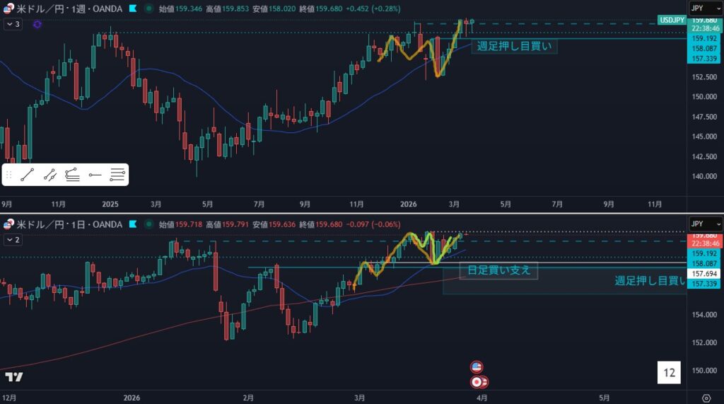 - 戻り売りを狙う場面だが日足の押し目買いエリアの可能性