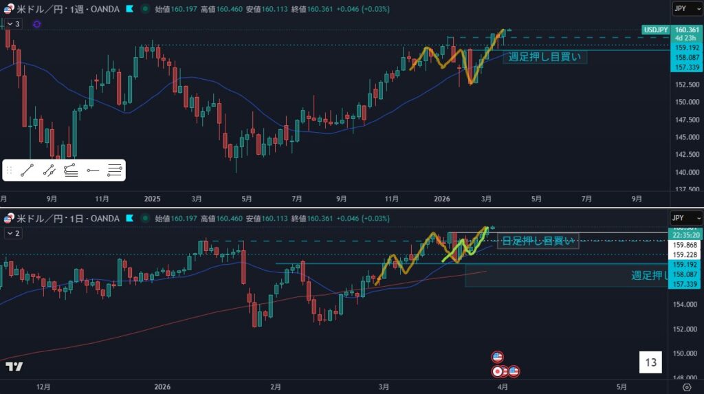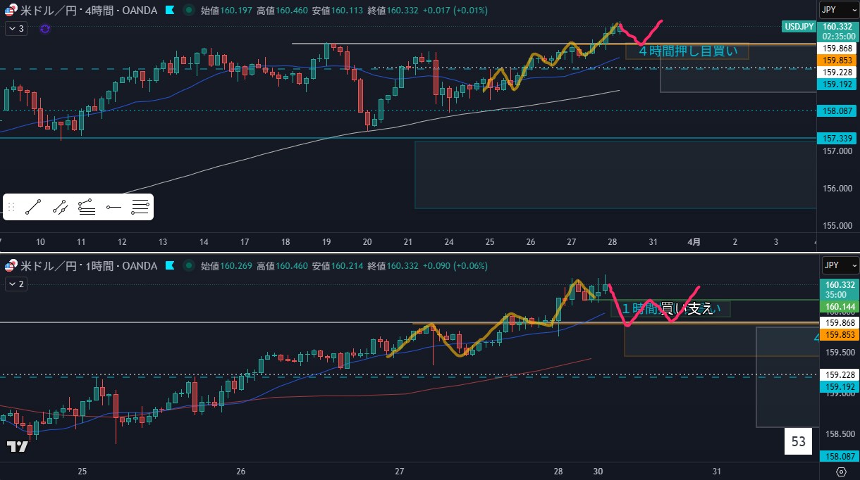 - 狙い:4時間押し目買いの押し待ち