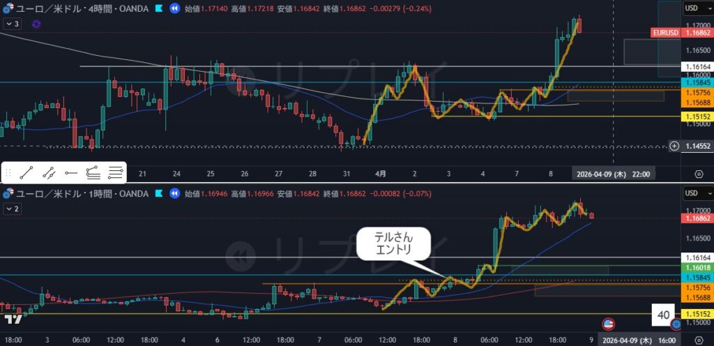 よく見ると4時間継続シグナル後の1時間押し目買い、なるほど!確かに今見たらわかる