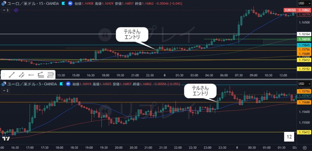 15分高値越えでエントリ。完璧だなぁ、そのあとエントリポイントを割ってないし。