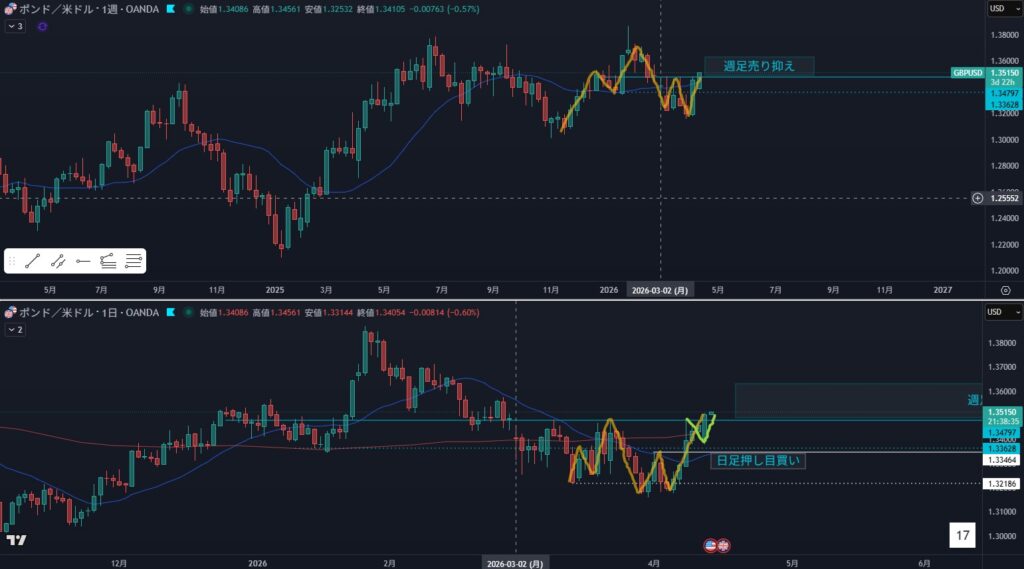 - ユロドル同様ダウが1本では違和感、黄緑ダウの可能性もアリ