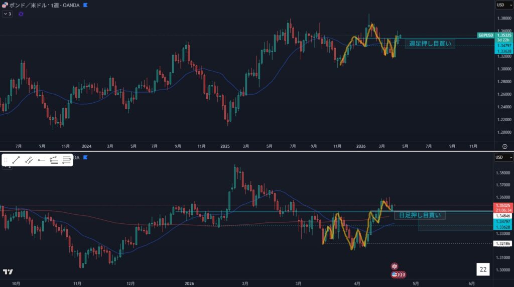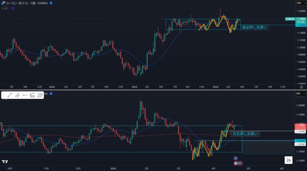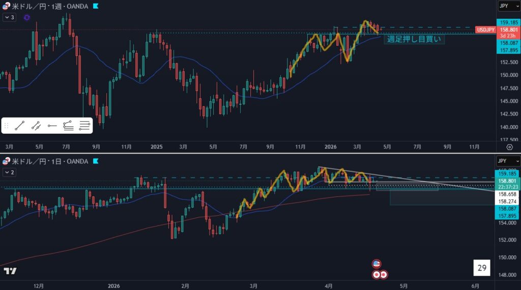- リスク:日足買い支え、週足押し目買い