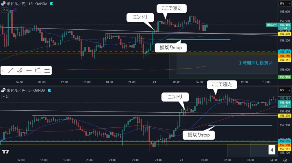 安値を作るまで待ってられなくて、159.3にstop置いて寝る