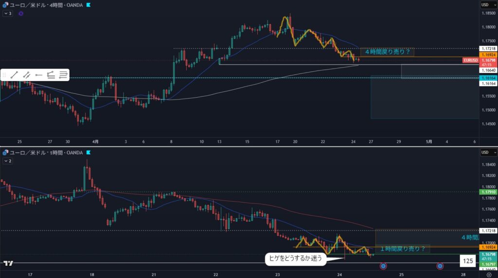 だからと言って狙えるかどうかは別。これはかなり厳しい。週足の波が出るかもとは思うが狙う波ではない。その中でいつも通りの4時間1時間の形が出たらラッキーかな