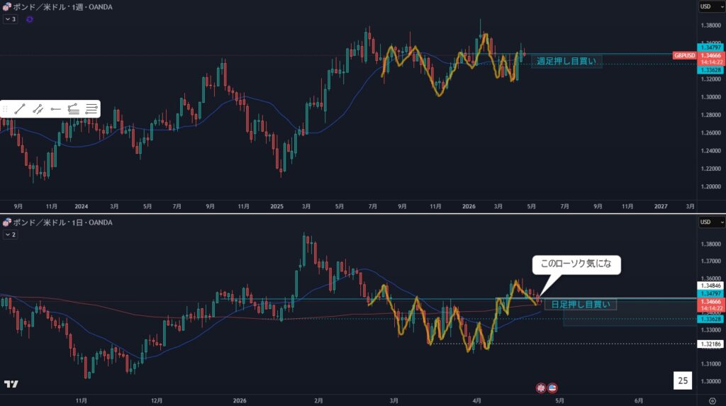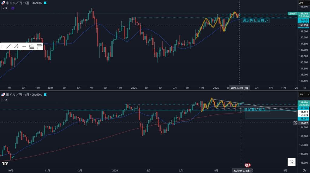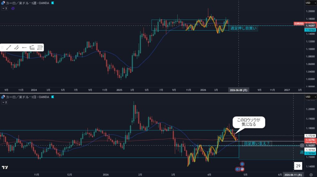 - 週足の押し目買い、攻防ライン抜けのポイントはすでにきたのか。高値超えをエントリポイントとするなら今はその直前に見える