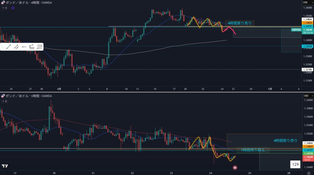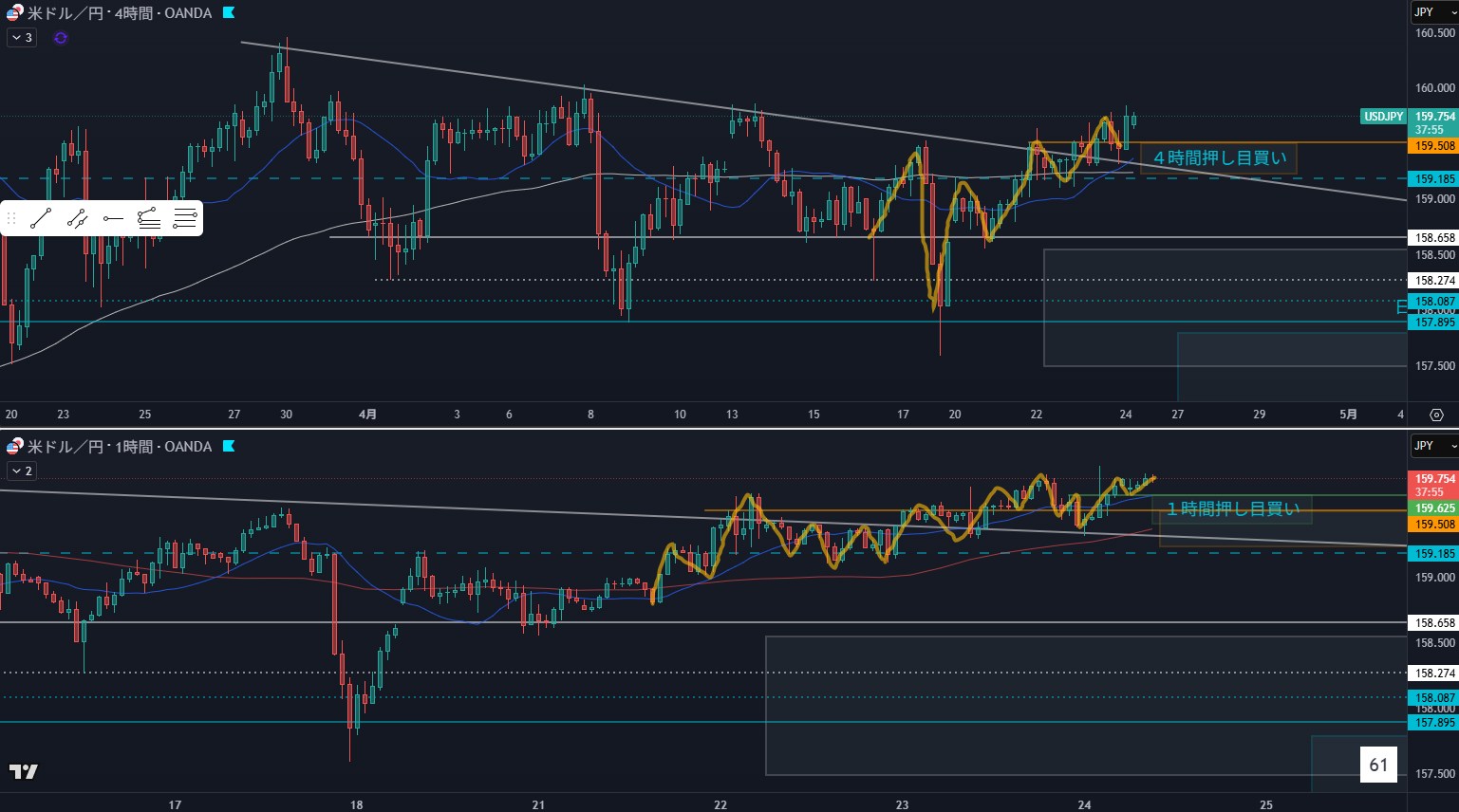 週足の押し目買い、日足のエントリポイント付近。って考えれば、普段の4時間狙いの15分の動きが、今の4時間の動きになるので、4時間のこういう動きも納得できる。