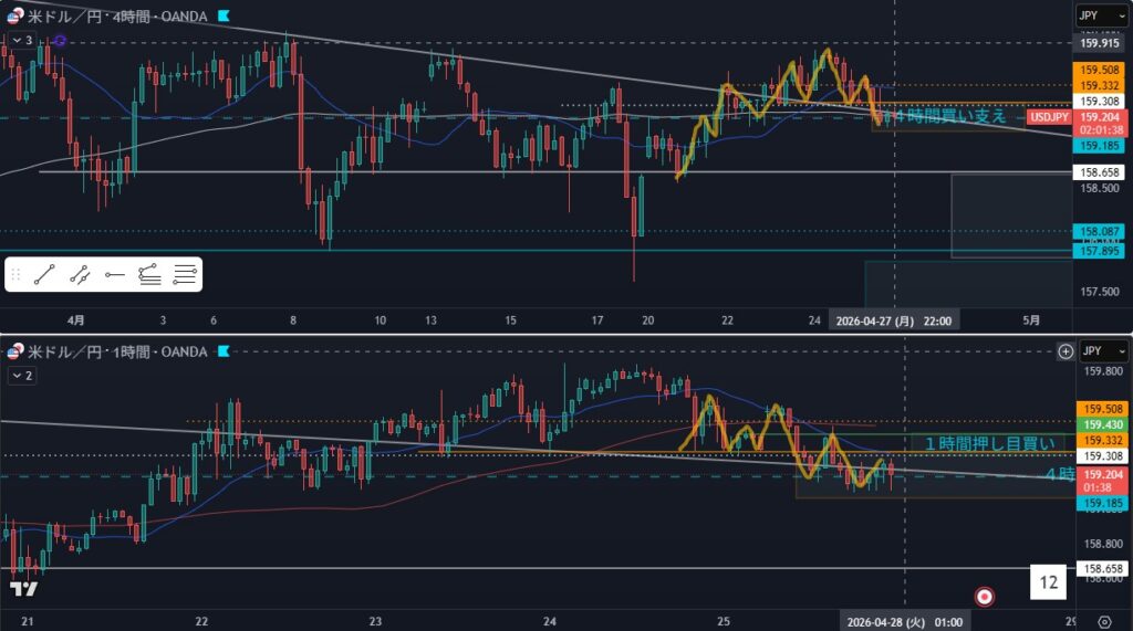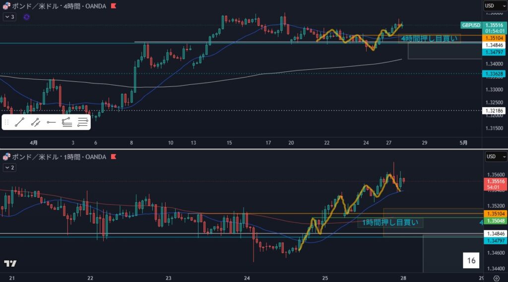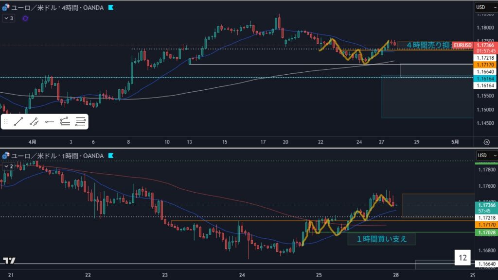 - 4時間黄緑ダウだとすると緑ラインがエントリポイント