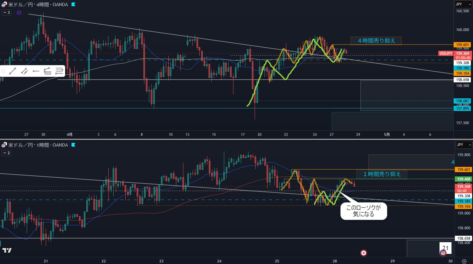 - 4時間黄緑ダウだとすると緑ラインがエントリポイント