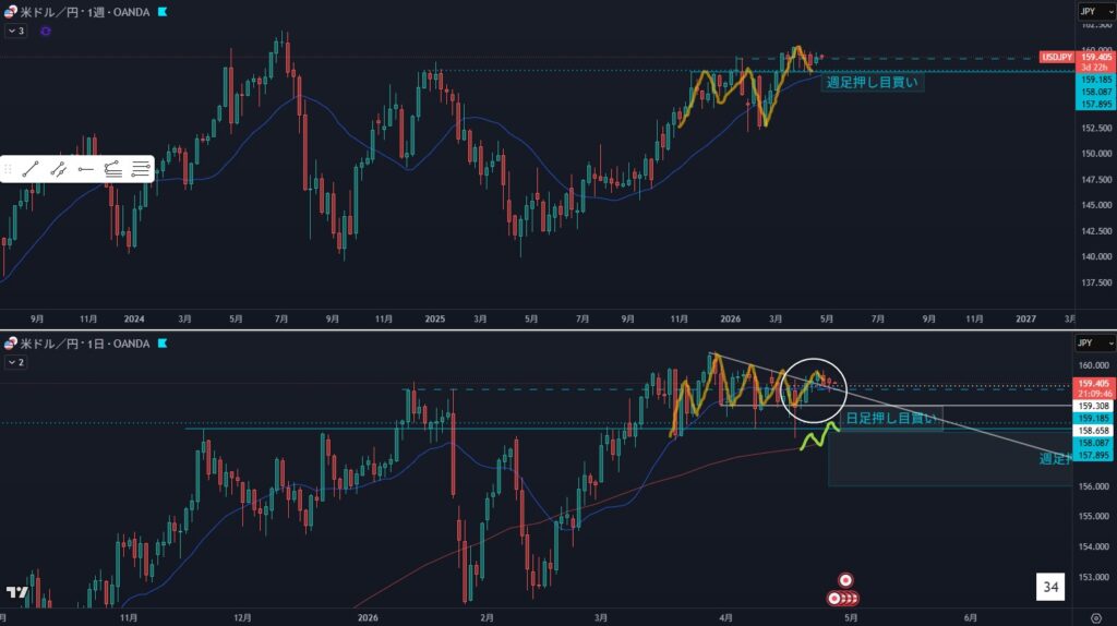 - 週足の押し目買い、攻防ライン抜けのポイントはすでにきたのか
